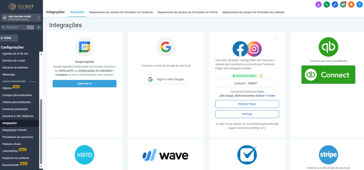 Integre WhatsApp, Instagram, e-mail, Meta, Google agenda e centralize 100% da sua operação.