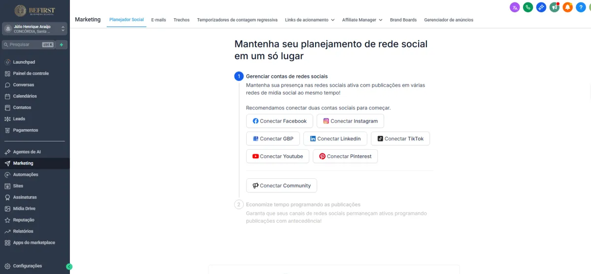 Integre suas redes sociais como Instagram, Facebook, LinkedIn, Youtube, Tik Tok e programe os conteúdos do seu calendário editorial direto no CRM BeFirst.